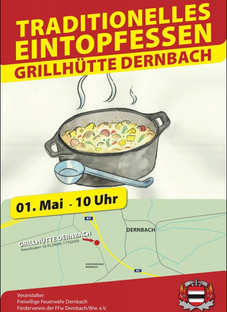 Der Förderverein der Freiwilligen Feuerwehr Dernbach/Ww e.V. lädt wieder gemeinsam mit dem Löschzug am 01. Mai zum traditionellen Eintopfessen an die Dernbacher Grillhütte ein. Ab 10:00 h geht es los.